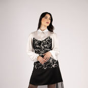 I raffinati ricami in bianco e nero con dettagli in filo d’oro, solcano la superficie setosa del cady e del taffetà per diventare preziosi accessori da indossare come fossero veri gioielli, proprio come le protagoniste inedite e indiscusse della collezione: le cravatte dall’anima femminile arbëreshë.
